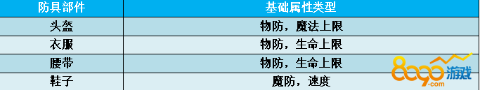 防具类装备分为头盔、衣服、腰带、鞋子四个部件,基础属性见下表: