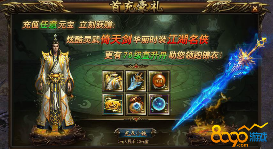 打开首充大礼包,即可获得:灵武-倚天剑*1、时装-江湖名侠*1、78级直升丹*1、超级铜钱卡*1,千万不要错过!