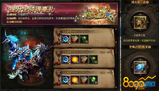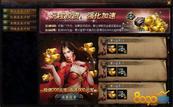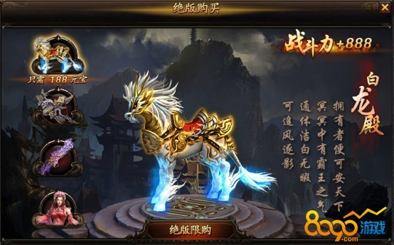 【活动内容】活动期间,点击活动界面即可购买绝版坐骑、灵武、红颜,战力飞升,轻松打BOSS,千万不要错过!