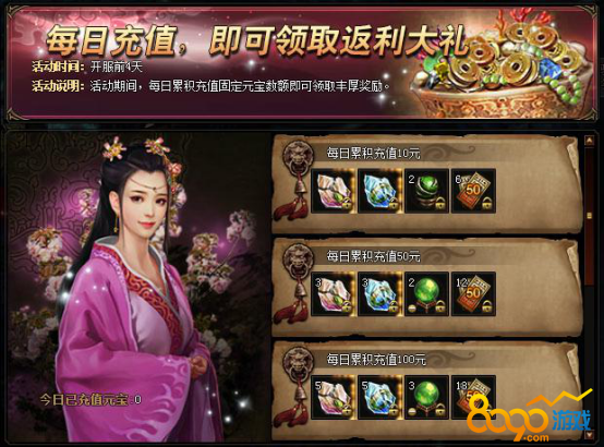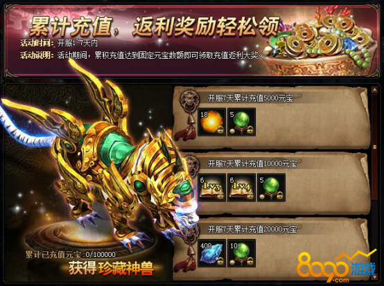 【活动内容】活动期间,累计充值达到指定金额,即可领取超值大礼包。红颜技能书、九天玄铁、项链结晶、淬金猛虎好礼送不停。