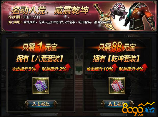 【活动内容】 活动期间,花费少量元宝即可获得八荒套装、乾坤套装,激活套装属性,大幅提升攻击。