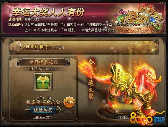 【活动内容】活动期间,每日均有今日特惠礼包,每购买一个礼包便随机获得一个幸运数字(1~100),每天晚上22:00公布幸运数字(1~100随机),如中奖则通过邮件的形式发送,如没有则当日幸运大奖不发放。