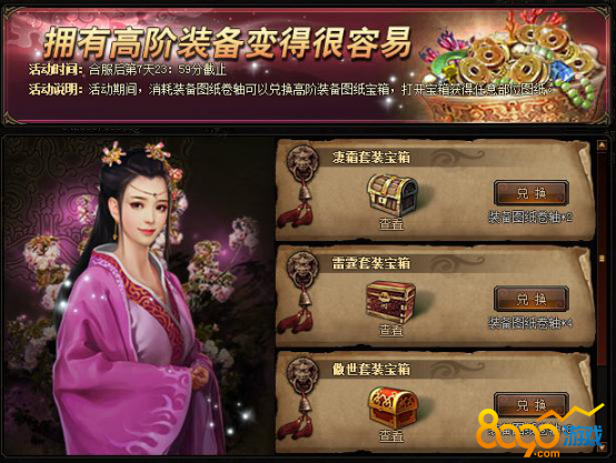 【活动内容】活动期间,消耗装备图纸卷轴即可兑换傲世套装、龙渊套装等高阶任意装备。