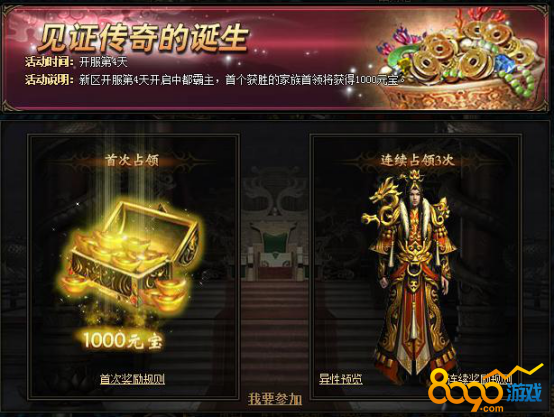【活动内容】开服第4天开启中都霸主争夺战!首个获胜的家族族长即可获得1000元宝奖励,连续3次获胜的家族族长即可获得专属时装。