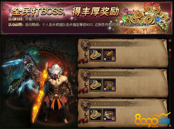 【活动内容】活动期间,个人或组队击杀指定等级BOSS,即可领取超值大奖,雷霆装、傲世装免费送~