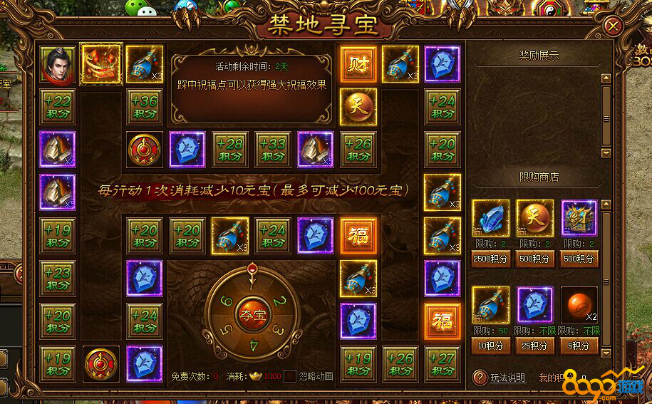 活动内容:摇动转盘,参与禁地寻宝,赢取各种散落奖励及积分!走完一圈更有机会获得终点大奖!