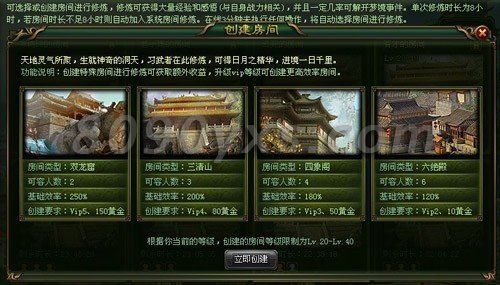 功能说明:创建特殊房间进行修炼可获取额外利益,升级VIP等级可创建更高效率房间。