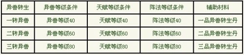 一转异兽,异兽等级40,天赋等级40,阵法等级40,需要一品异兽转生丹。