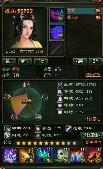 生命36783/36783,外攻4062-4119,内攻9015-9206,外防1263,内防1375.