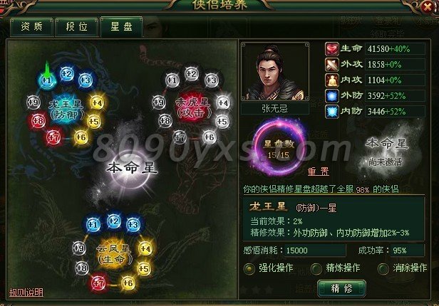 龙王星:(防御)一星,当前效果2%,精修效果,外功防御、内功防御增加2%-3%。