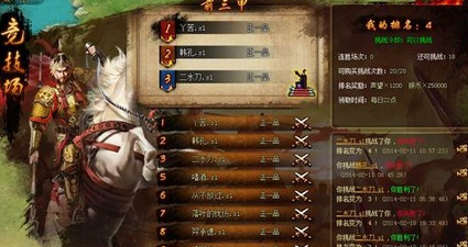 当玩家官职达到从八之后,竞技场解锁,点击屏幕上方的竞技场,就可以看到自己在竞技场的排名,连胜等信息。