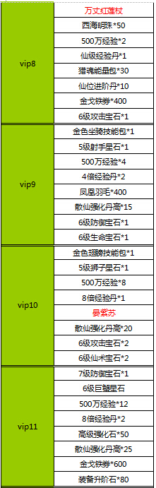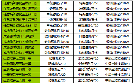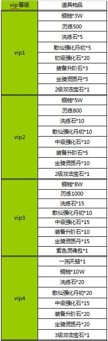 【活动内容】累计充值达到不同的vip等级,每个vip等级都有福利倾情相送!不仅包含各种珍贵实用的道具,珍稀装备、拉风坐骑、高级宝石更是应有尽有!还有橙色散仙、红色散仙等你拿~