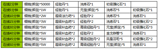 【活动内容】每天累计在线时长达到2、5、10、15、30、40、45、50分钟即可获得铜币、元宝等奖励。