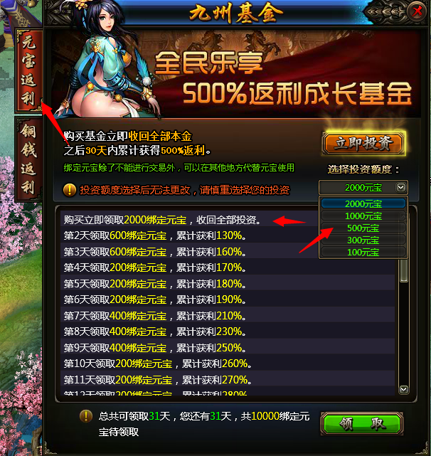 1、元宝返利——投资100~2000元宝可以立刻收回本金的绑定元宝之后30天内累计获得500%返利。PS.每位玩家只能投资一次,请慎重选择