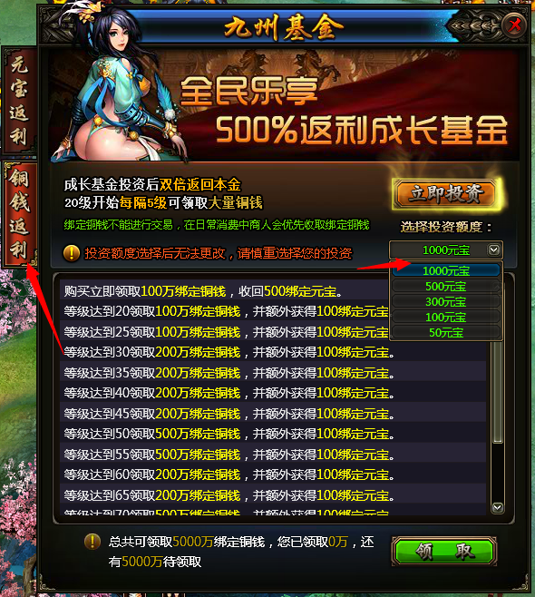 2、铜钱返利——投资50~1000元宝可获得500%的返利,包括了绑定元宝和海量铜钱,最多可返还5000万铜钱!心动不如行动,赶快购买吧。PS.每位玩家只能投资一次,请慎重选择!