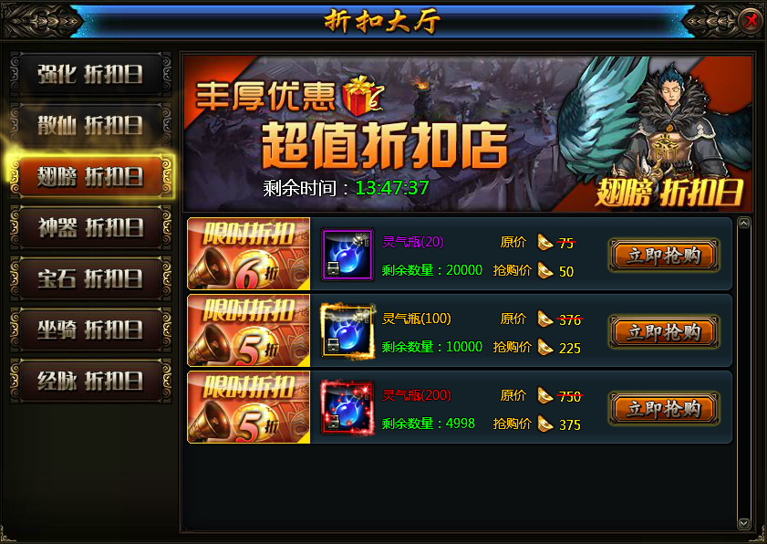 【活动内容】开服7日新增限时折扣活动,每天开启一个系统的商品限量打折。