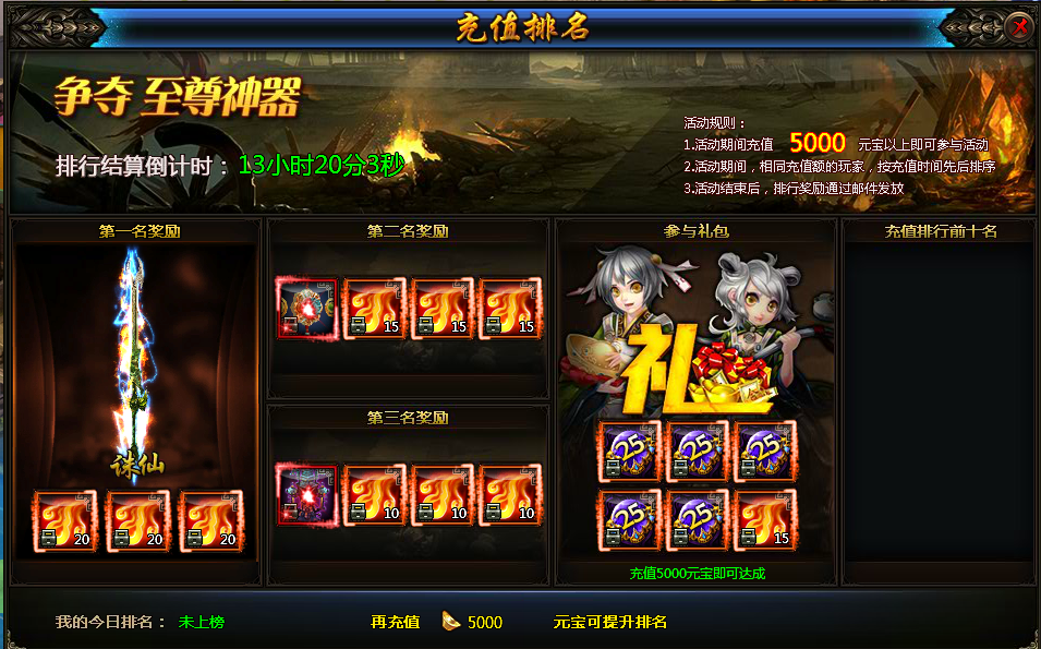 【活动内容】开服第二天开启充值排名活动,充值满5000元宝以上,即可参与该活动。充值额相同的玩家,按充值时间先后排序,活动结束时按排名进行奖励发放。