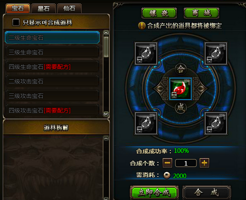 配方则需要花费元宝30个和25个宝石碎片购买。在宝石碎片商城就可以兑换到了。好了如果有了配方,也可以合成了,则需要4个同属性的3级宝石合成一个4级宝石。同时合成宝石还有几率的,在合成界面下方可以显示。