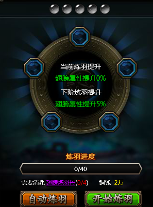 炼羽需要哪些道具才能决定怎么去进行,想要翅膀炼羽必须要先筹齐了翅膀炼羽丹,这是玩家炼羽最主要的道具材料,按等级不同需要的材料数量也有所不同。其次玩家还需要有大量的铜钱作为基础。炼羽功能给玩家带来每提升一阶,翅膀属性提升5%,没错,所以的翅膀属性都提升百分之5 ,翅膀属性越好加成越高。