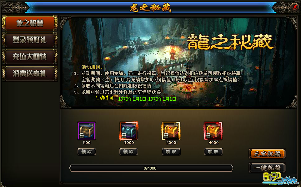 1、活动期间,使用龙鳞、元宝进行祝福,当祝福值达到相应数量可领取相应档次的宝箱奖励