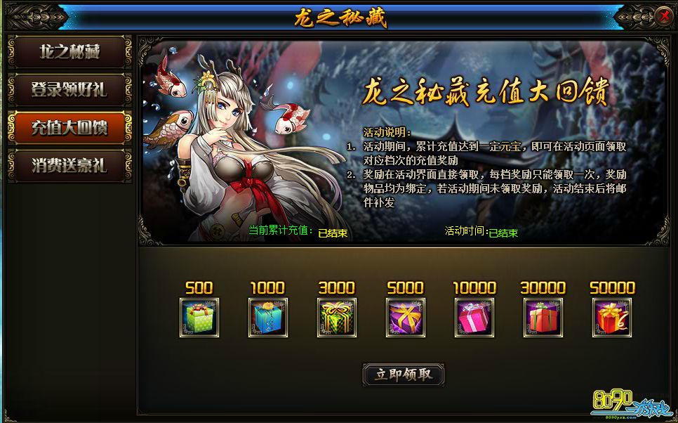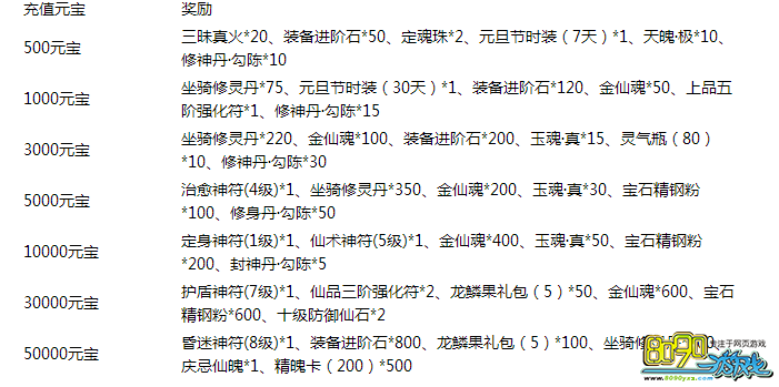 1、活动期间,累计充值达到一定元宝,即可在活动页面领取对应档次的充值奖励