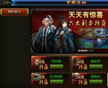 活动期间,参与六大副本(奇珍阁、镇妖塔、蓬莱仙境、石灵仙府、锁仙台、聚宝楼) 可获得奖励双倍掉落,所以这几个都是大家最喜欢的东西啊。