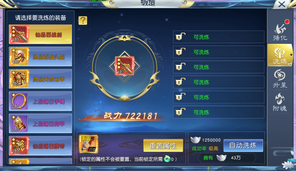 2. 洗炼:玩家通过银两洗炼装备,获得随机属性,可使用仙玉锁定洗炼的属性,防止被再次洗炼掉