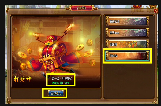 玩家的游戏角色达到27级即可开启打财神,攻击财神,将财神打死后,给予相应的奖励,每日攻击该怪物有次数上限,每日可通过该系统免费获得一定的铜钱奖励,铜钱奖励随玩家游戏角色的等级增加而增加。