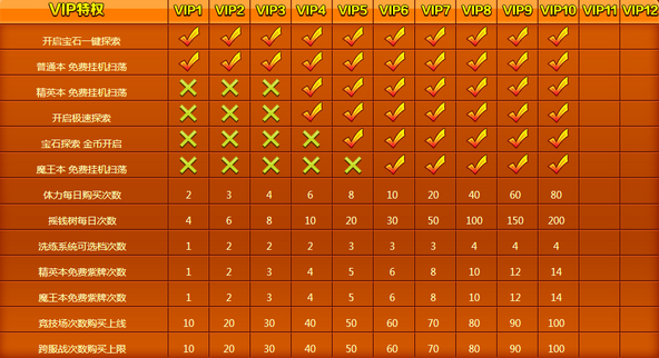 普通本的扫荡:在游戏中期,我们有每日必做这个任务,那么每天扫荡几下副本是必然的,那么开启这个功能可以节约掉我们1个多小时的挂机时间,起点也不高,VIP1就可以开启。精英本和魔王本免费挂机在游戏中期,我们每天都要去刷各种副本,那么开启这个也是必要的,可是开启条件相对较高。体力购买次数这个特权主要是用在开服七日活动和冲级身上。