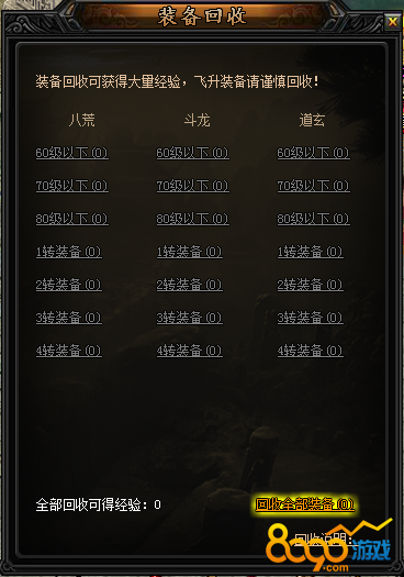 在装备回收系统里,可以回收八荒,斗龙,道玄三个职业的装备,可以回收60级以下装备,70级以下装备,80级以下装备,1转装备,2转装备,3装装备,4转装备。但是战力评分比当前装备高的本职业装备不会被回收哟~