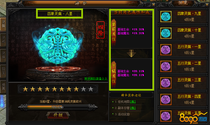 佩戴灵佩可以提升角色的基础生命和基础魔法。灵佩等级越高,角色的基础生命和基础魔法加成就越高。灵佩一共有10阶,每一阶都有10颗星。