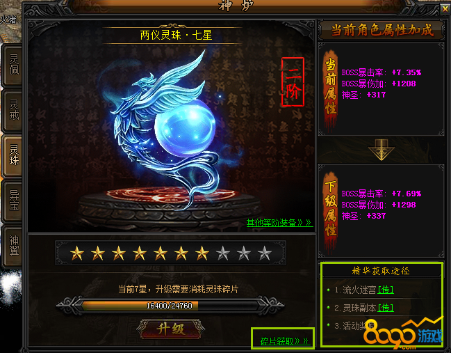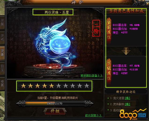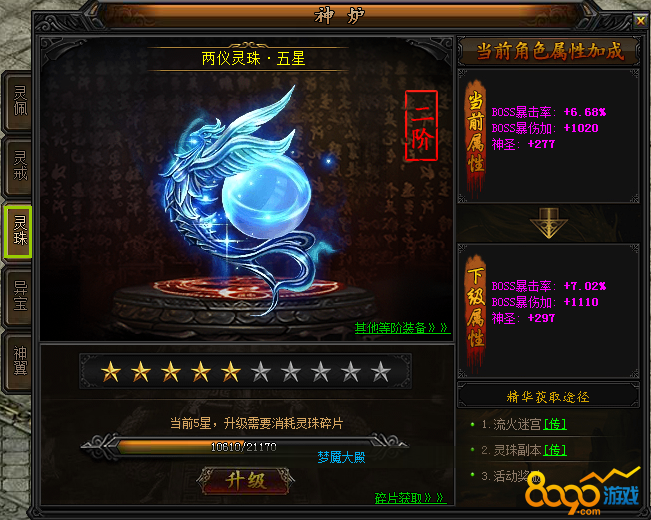 佩戴灵珠可以提升角色对boss的暴击率和对boss的暴伤加成,还会提升神圣值。灵珠等级越高,角色对boss的暴击率,对boss的暴伤加成和神圣值就越高。灵珠一共有10阶,每一阶都有10颗星。