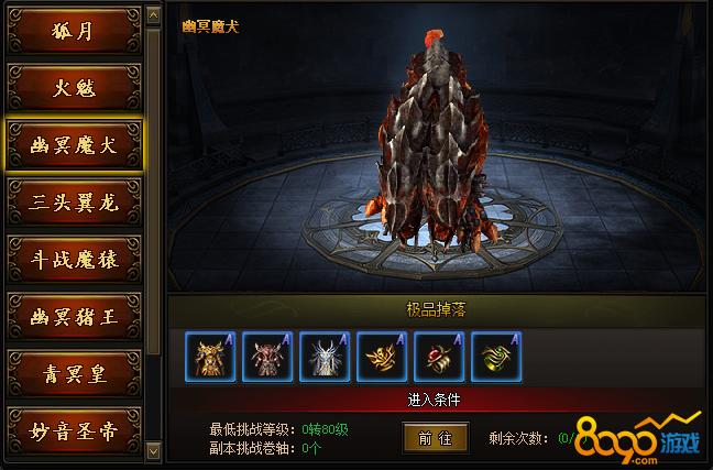神威炼狱:这里面的所有boss都在神威炼狱的地图里。需要消耗神威卷轴进入。每个Boss都有最低挑战等级。显示所有Boss的刷新时间,刷新状态。同时还会有几率掉落极品装备。