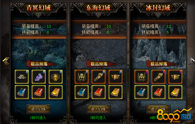 精英幻域:共有六个幻域,分别要达到70级,75级,1转,2转,3转,4转才能进入。每个幻域里面都会有数量不等的装备精英和技能精英。同时还会有几率掉落极品装备。