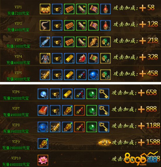 VIP系统是充值元宝获得VIP等级BUFF和丰富的礼包奖励的系统。