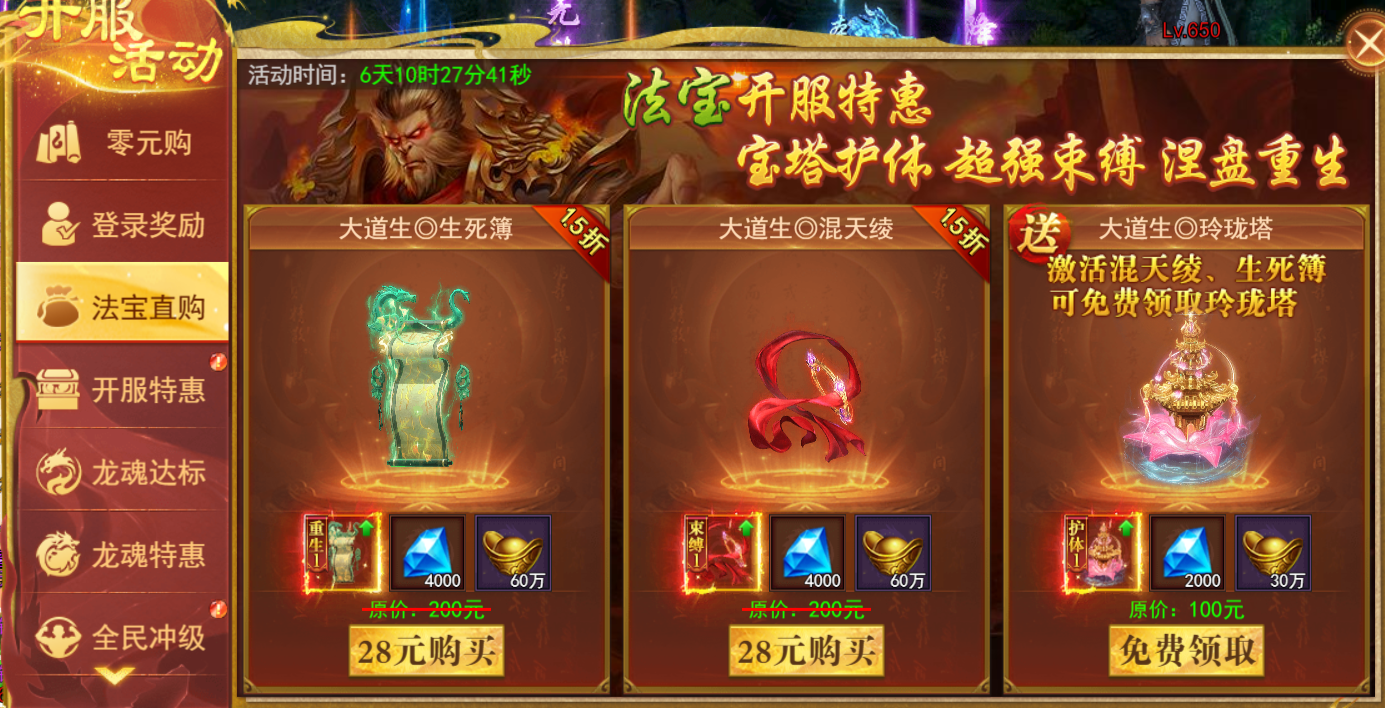 法宝开服特惠,宝塔护体,超强束缚,涅槃重生。激活混天绫、生死簿可免费领取玲珑塔。