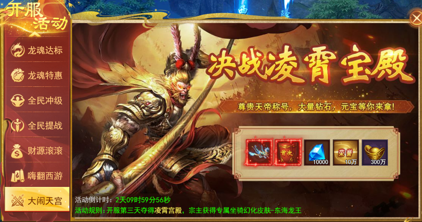 新服开服第三天20:00-20:30开启活动,决战凌霄宝殿,城主专属坐骑尊-东海龙王等您来拿,还有大量钻石元宝等奖励。