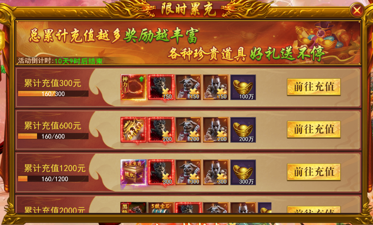 活动期间总累积充值越多奖励越丰富,各种明珍贵道具好礼送不停。