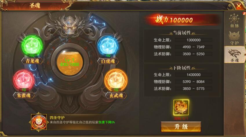 6、新增血脉圣魂,开服30天开启,入口:血脉-圣魂,升级可激活四圣守护获得百分比属性加成和伤害下降效果
