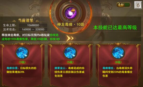 道士神技:神龙毒瘴-- 释放神龙毒瘴,对目标范围内6格玩家持续造成毒瘴伤害,并降低防御,技能提升到3、5、8级还可以激活特殊效果