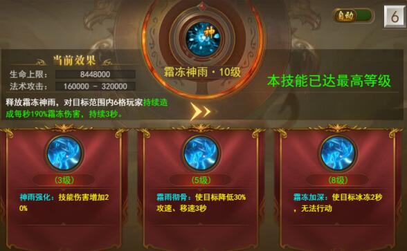 法师神技:霜冻神雨--对目标范围6格玩家持续造成霜冻伤害打击,技能提升到3、5、8级还可以激活特殊效果