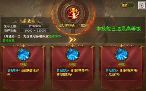 战士神技:裂地神斩--飞身猛烈一击,对区域周围四格玩家造成裂地伤害,技能提升到3、5、8级还可以激活特殊效果