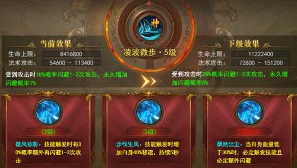 被动神技:凌波微步--受到攻击时概率闪避1-3次攻击,永久增加闪避概率,技能提升到3、5、8级还可以激活特殊效果