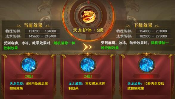 被动神技:天龙护体--受到麻痹、冰冻、眩晕效果时,随机清除一种负面效果,技能提升到3、5、8级还可以激活特殊效果