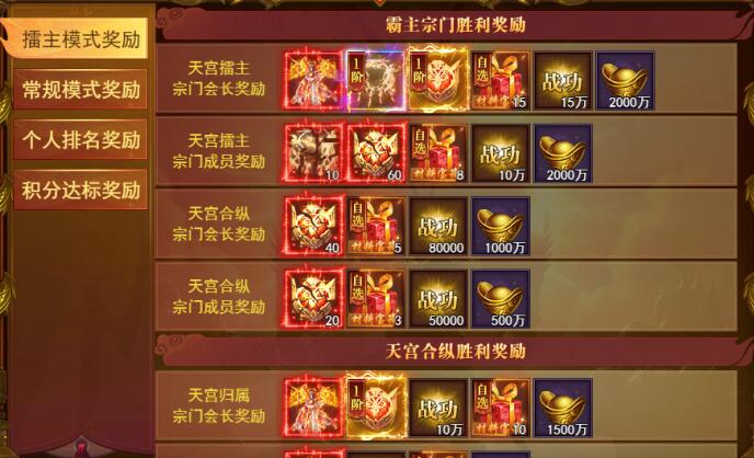 活动奖励分为擂主模式奖励、常规模式奖励、个人排名奖励和积分达标奖励: