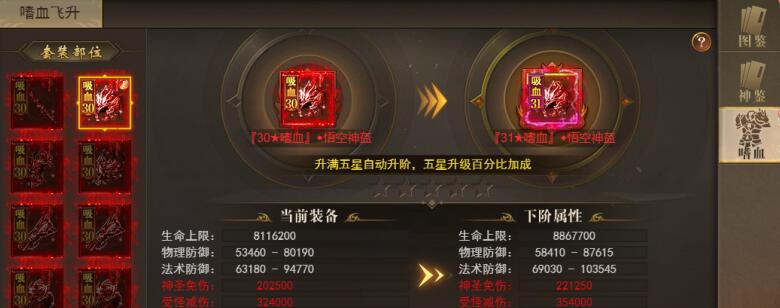 嗜血飞升为嗜血神装等阶拓展系统,每升五星自动升阶,获取大量属性!
