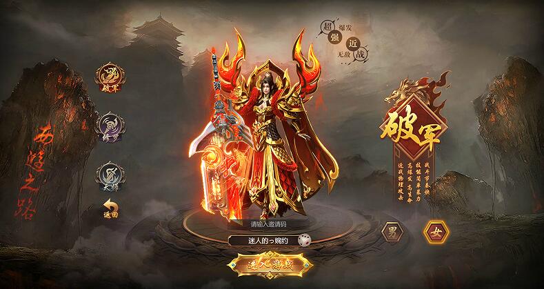 1.1破军:近战物理攻击职业。怒火斩,横扫天下,凤舞九天,狂野冲刺,摄魂擒拿让对手无路可逃,高额的爆发,高额的生命力,及高额的物理防御,生存能力无人能及,操作简单粗暴,PK节奏奔放豪爽!