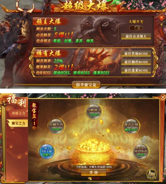 超级大爆:击杀等级、封魔、真言、神灵领主boss有概率触发,触发后必定进行5爆,有开关可控制开启关闭