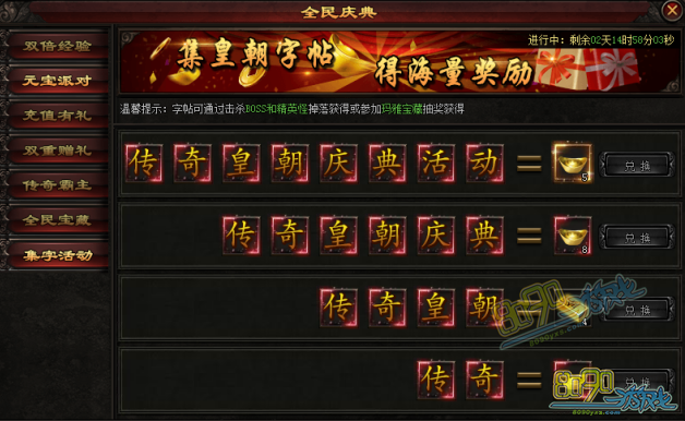 活动内容:活动期间,击杀BOSS、精英怪或者开启玛雅宝藏,将会掉落字帖,集齐一定组合的字帖即可兑换各种奖励!