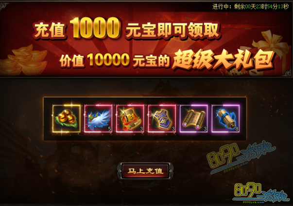 活动内容:活动期间,充值一定元宝即可领取超值奖励回馈。